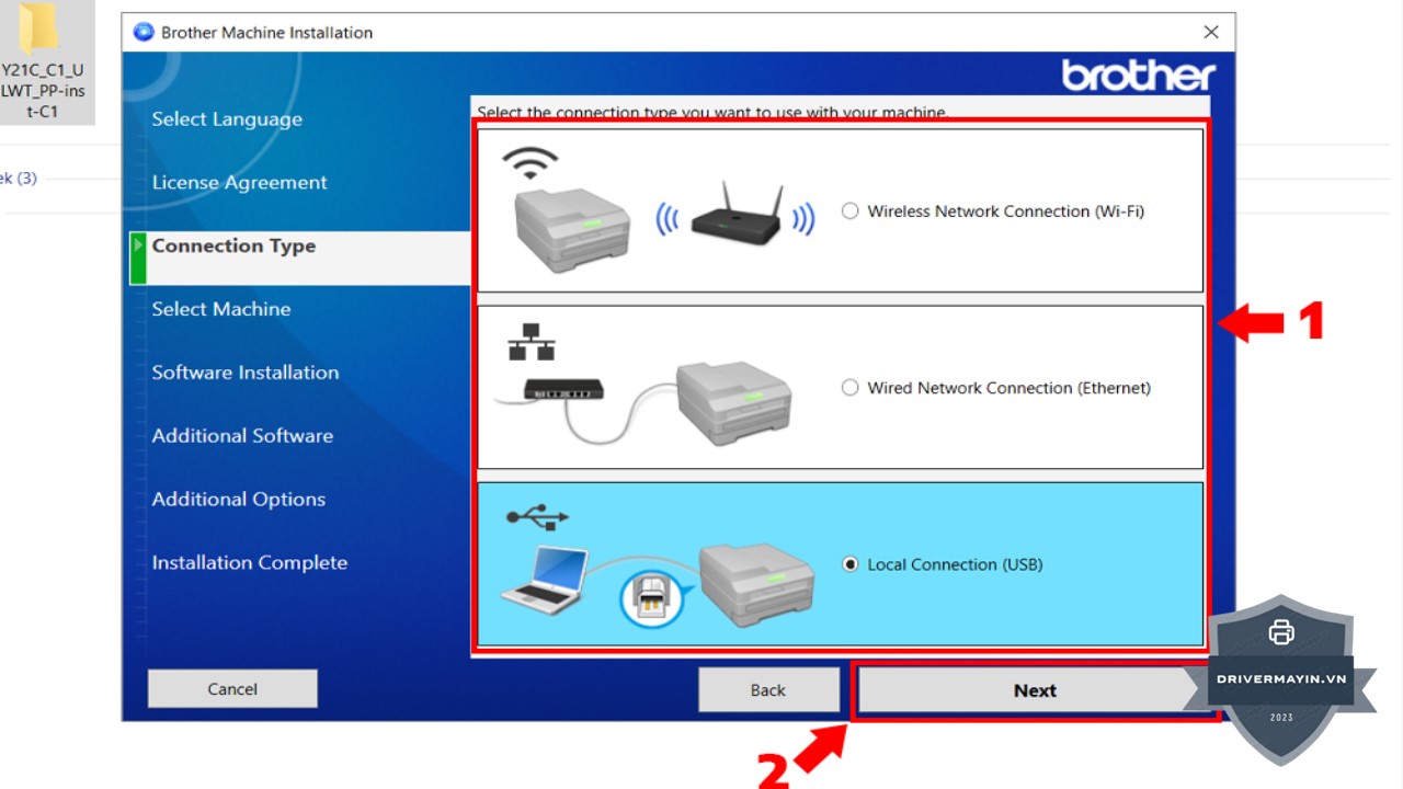 Bước 4: Chọn kiểu kết nối giữa máy tính và máy in (USB hoặc Wi-Fi), sau đó nhấn Next để tiếp tục.