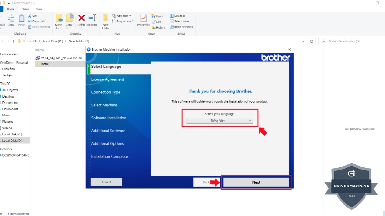 Bước 2: Chọn Tiếng Việt (hoặc ngôn ngữ khác nếu bạn muốn) và nhấn Next để tiếp tục.