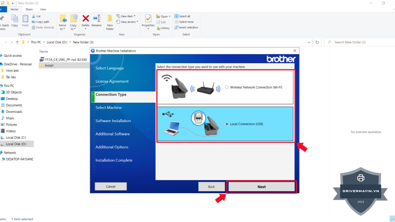 Bước 4: Bạn sẽ được yêu cầu chọn kiểu kết nối giữa máy in và máy tính, có thể là Wi-Fi, USB hoặc mạng LAN. Chọn đúng phương thức kết nối mà bạn đang sử dụng và nhấn Next.