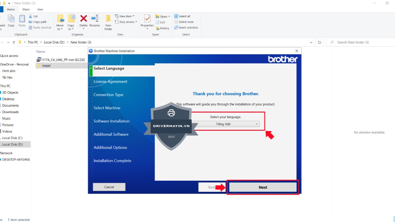 Tiếp theo, bạn cần tick chọn vào ô I accept this license agreement để đồng ý với các điều khoản và điều kiện của Brother. Sau đó, nhấn Next để tiếp tục.