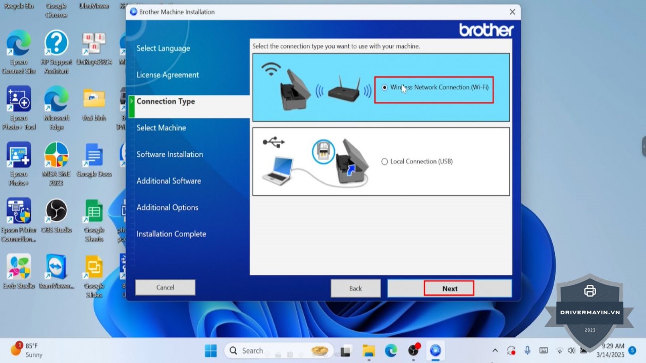 Chọn phương thức kết nối: Chọn Wireless Network Connection (Wi-Fi) và nhấn Next.