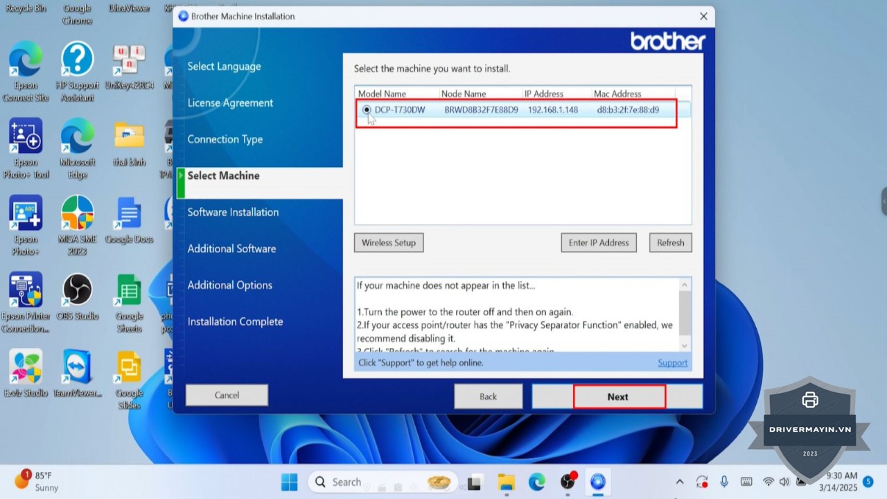 Chọn máy in: Chọn máy in Brother DCP-T730DW từ danh sách thiết bị tìm thấy và nhấn Next.