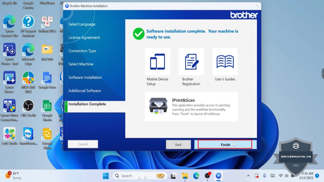 Hoàn tất cài đặt: Nhấn Next, sau đó nhấn Finish để kết thúc quá trình cài đặt. Phần mềm Brother iPrint&Scan sẽ được cài đặt trên máy tính của bạn.