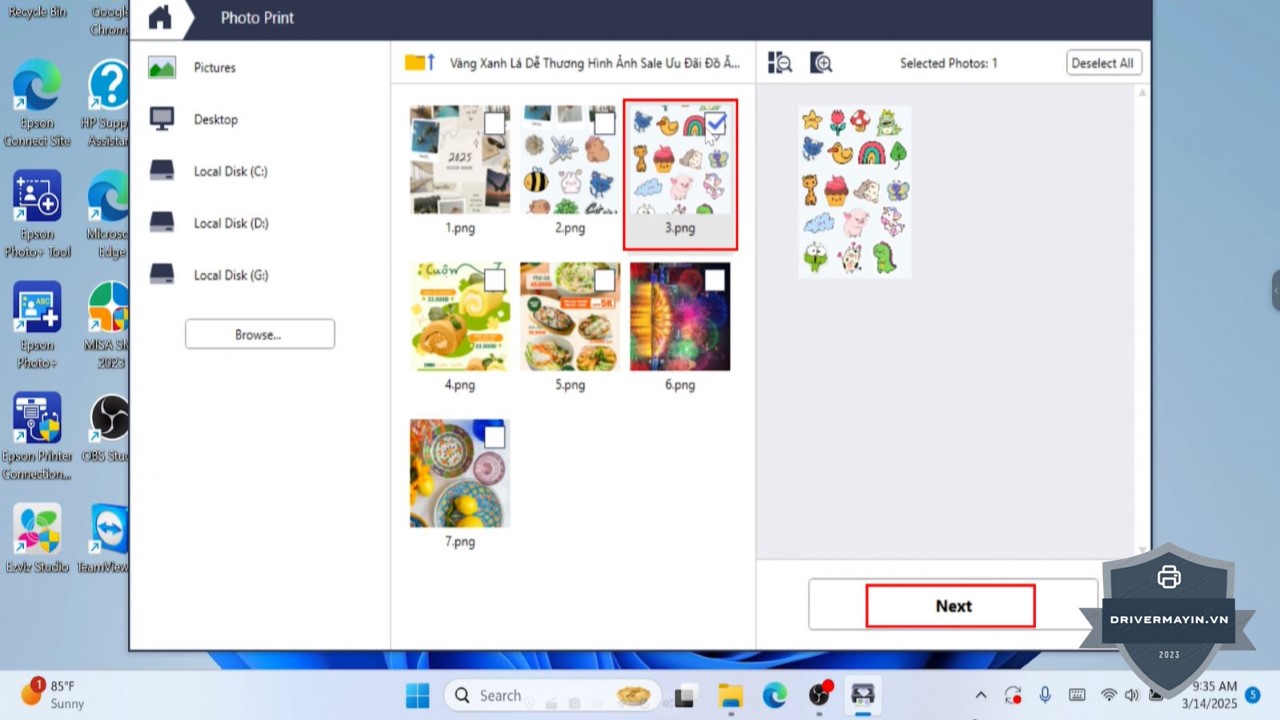 Chọn file ảnh để in: Tích chọn file ảnh từ máy tính mà bạn muốn in và nhấn Next.