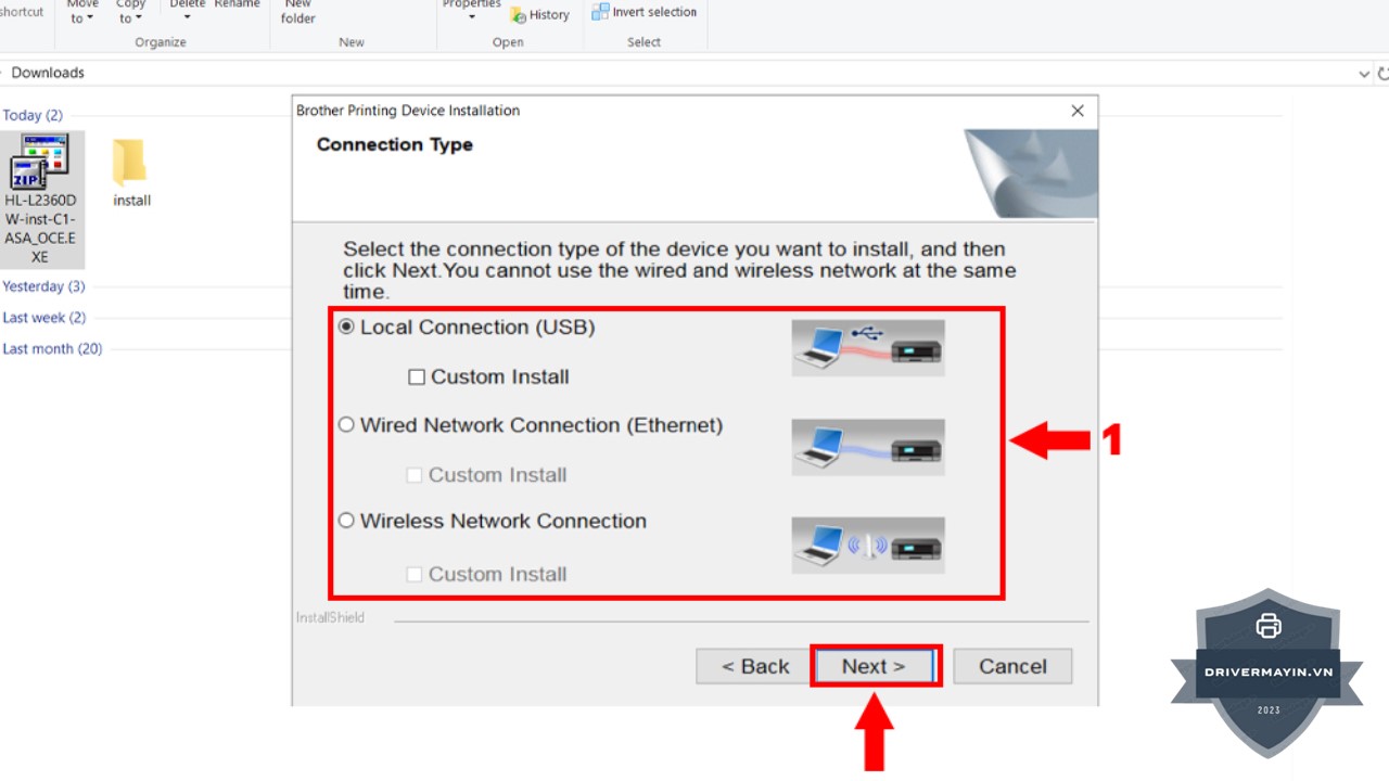 Lựa chọn phương thức kết nối: Sau khi đồng ý với các điều khoản, bạn sẽ được yêu cầu chọn phương thức kết nối máy in với máy tính của mình. Tại đây, bạn có thể chọn một trong các phương thức kết nối sau: