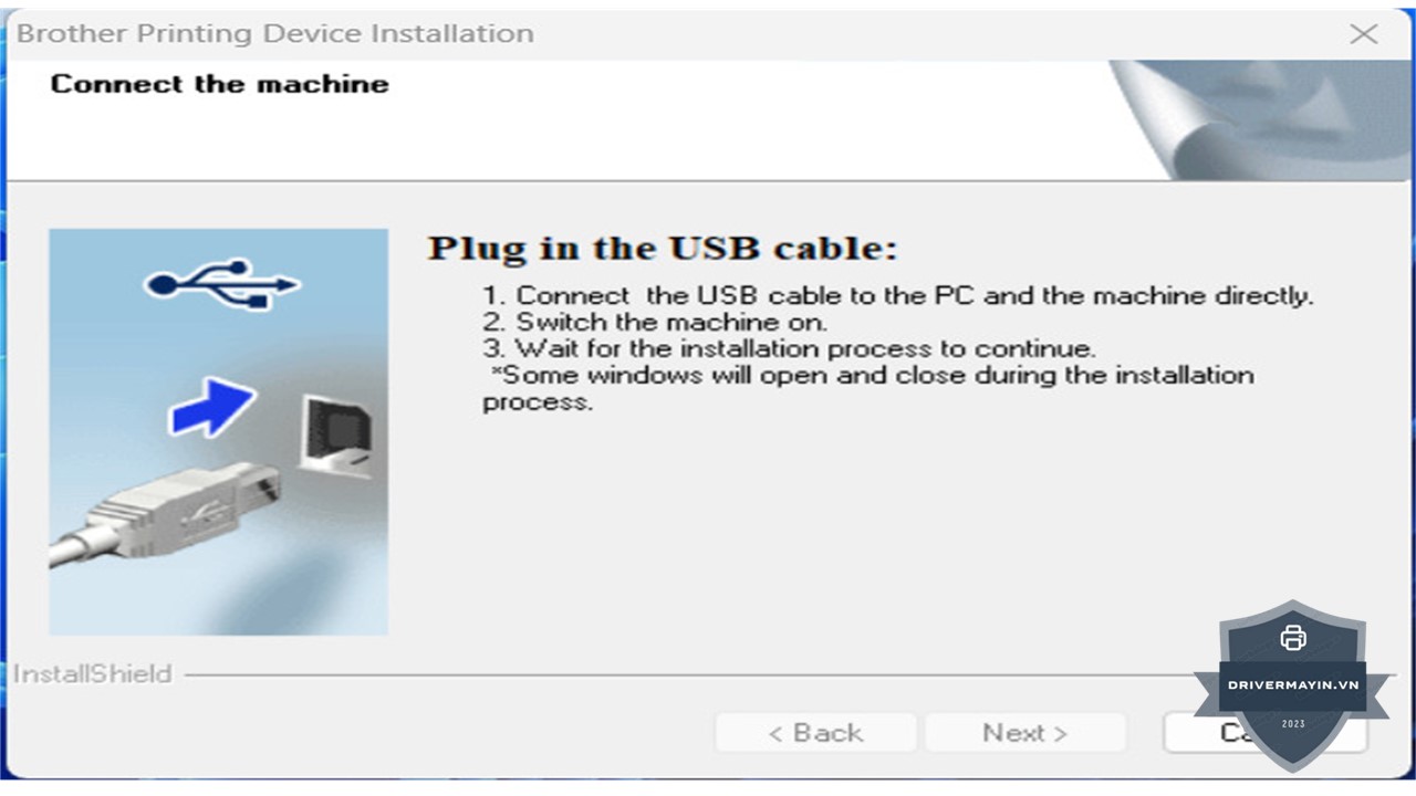 Bước 7: Khi đến bước này, chương trình sẽ yêu cầu bạn kết nối máy in với máy tính thông qua cáp USB 2.0. Nếu bạn đã kết nối cáp nhưng vẫn nhận thông báo yêu cầu, hãy kiểm tra lại xem cáp có được cắm chặt chưa. Nếu đã cắm đúng mà vẫn gặp lỗi, bạn có thể thử thay cáp USB khác hoặc kiểm tra lại cổng USB của máy tính. Khi cáp kết nối thành công, biểu tượng Next sẽ sáng lên, lúc này bạn nhấn Next để tiếp tục.