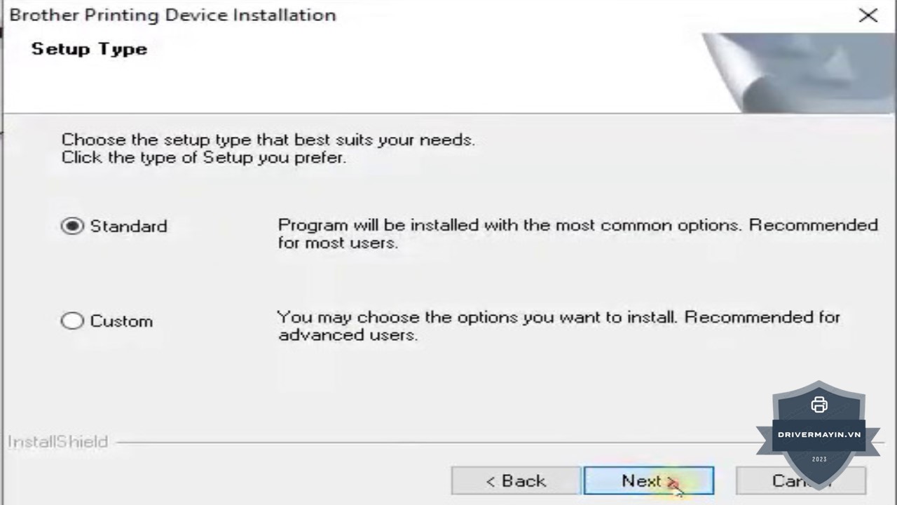 Đối với máy in Brother MFC-L2701D, chỉ có kết nối qua cáp USB 2.0, vì vậy bạn chọn Standard và nhấn Next để tiếp tục.