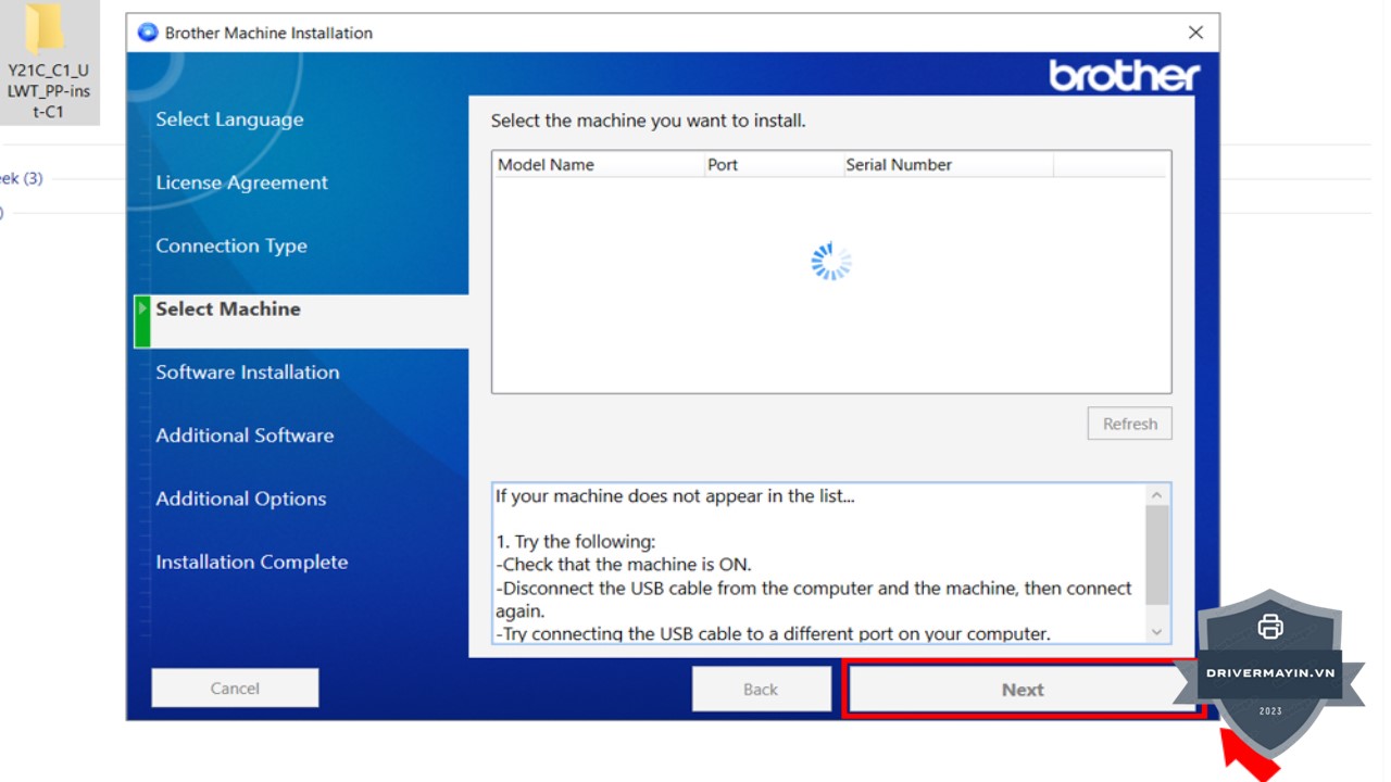 Bước 5: Chọn máy in bạn muốn cài đặt driver và nhấn Next để tiếp tục.