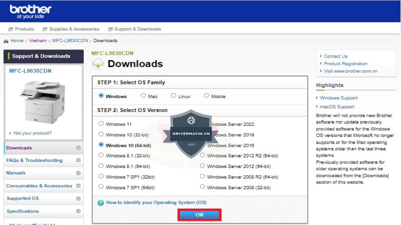 Ở bước này, hệ thống sẽ tự động nhận diện hệ điều hành của máy tính bạn. Brother MFC-L9630CDN hỗ trợ driver cho ba hệ điều hành phổ biến là Windows, Mac, và Linux, cũng như phiên bản cho Mobile đối với các dòng máy in có kết nối Wi-Fi như Brother 9630CDN.