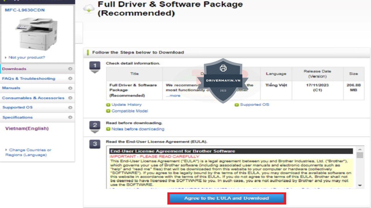 Khi đã chọn phiên bản driver phù hợp, bạn chỉ cần nhấn vào ô “Agree to the EULA and Download” để đồng ý với các điều khoản và điều kiện của Brother. Hệ thống sẽ bắt đầu tải driver về máy tính của bạn.