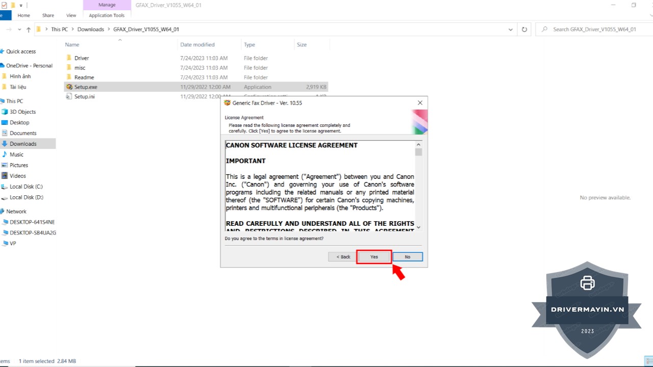 Khi màn hình hiển thị Điều khoản sử dụng, chọn Yes để đồng ý với các điều khoản của Canon và tiếp tục.