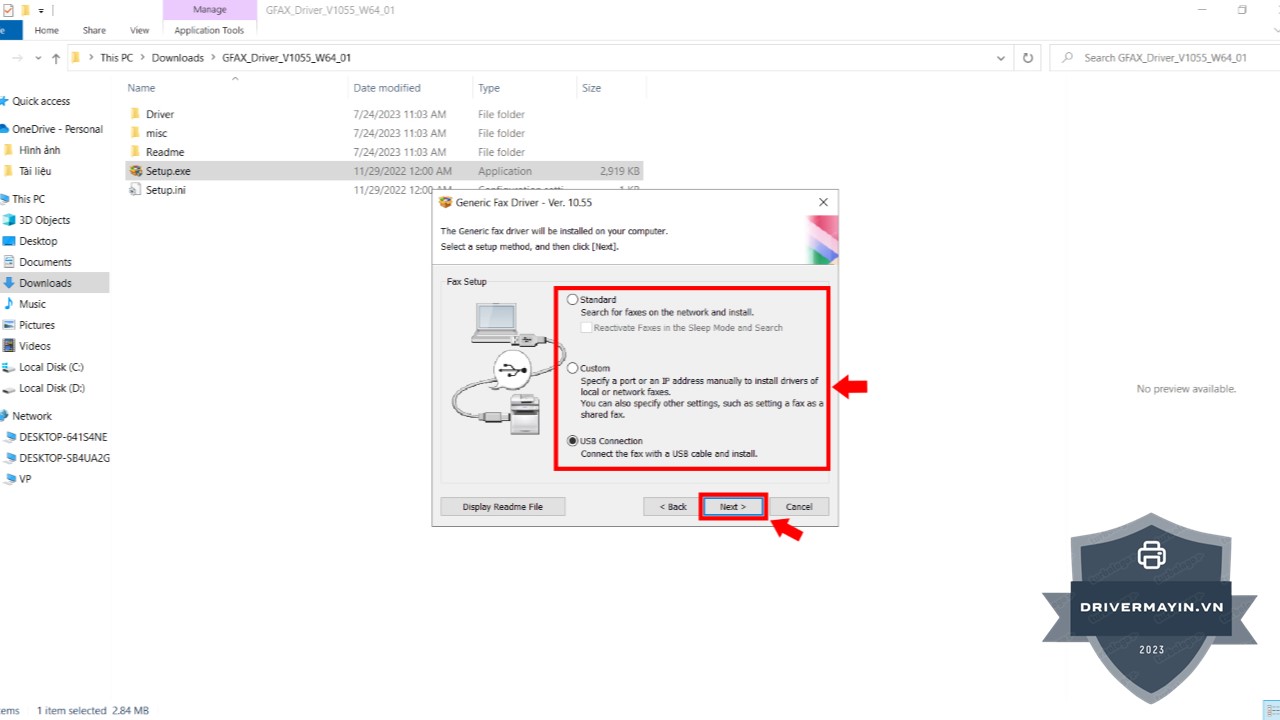 Chọn kiểu kết nối mà bạn muốn sử dụng (USB hoặc mạng không dây) và nhấn Next.