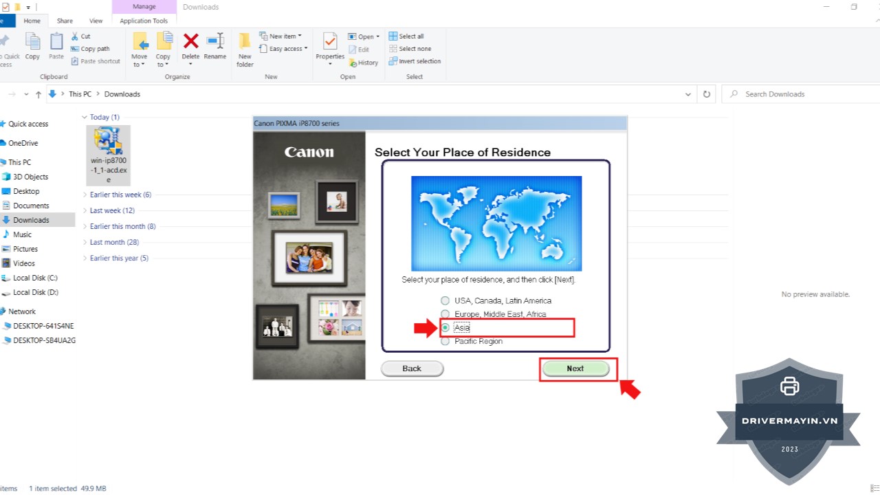 Tiếp theo, bạn sẽ được yêu cầu chọn khu vực nơi bạn đang sinh sống. Tại đây, chọn Asia trong danh sách các khu vực và nhấn Next để tiếp tục. Việc chọn đúng khu vực giúp phần mềm cài đặt driver tương thích với các yêu cầu khu vực và hệ thống mạng.