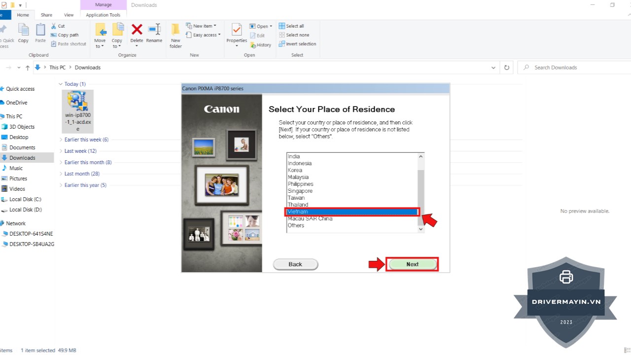 Sau khi chọn khu vực, bạn sẽ tiếp tục được yêu cầu chọn quốc gia của mình. Chọn Vietnam (Việt Nam) từ danh sách và nhấn Next để tiếp tục. Điều này đảm bảo rằng các thiết lập và ngôn ngữ cài đặt sẽ phù hợp với khu vực của bạn.