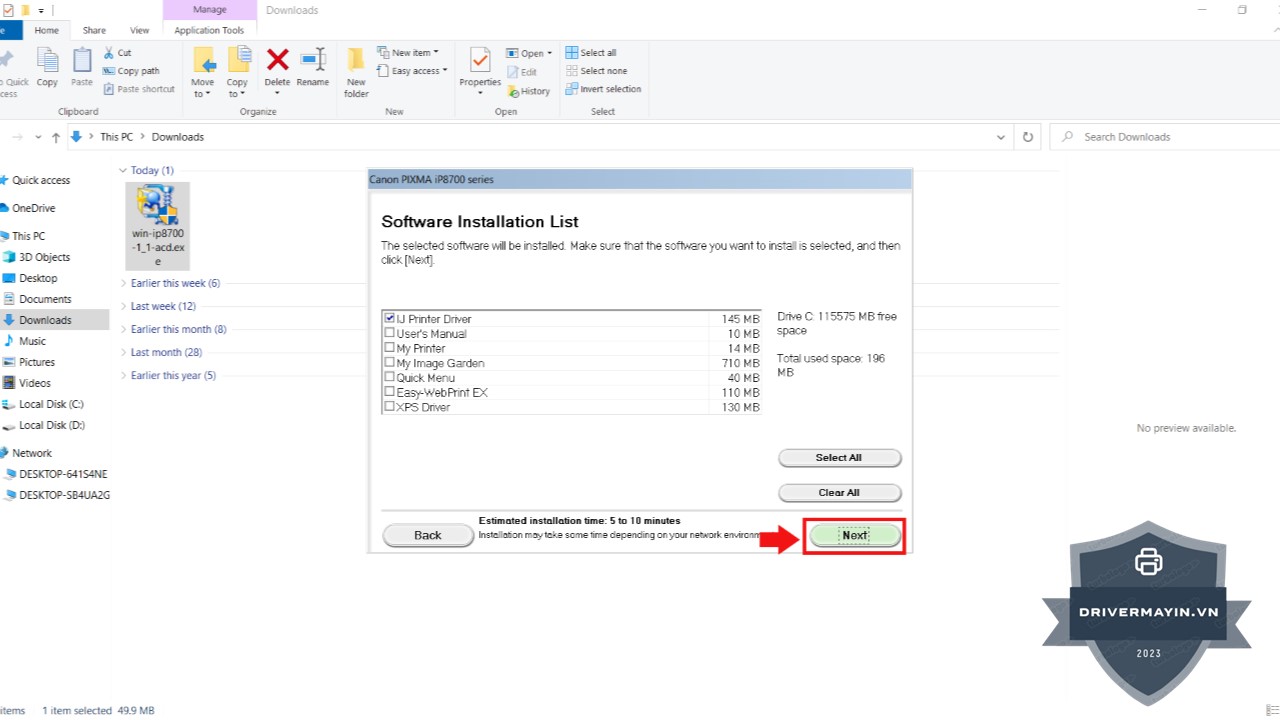 Sau khi đồng ý với các điều khoản, bạn sẽ được yêu cầu nhấn Next để bắt đầu quá trình cài đặt driver. Hệ thống sẽ tự động tiến hành việc cài đặt driver máy in và các phần mềm hỗ trợ cần thiết để đảm bảo máy in có thể hoạt động tối ưu với máy tính của bạn.