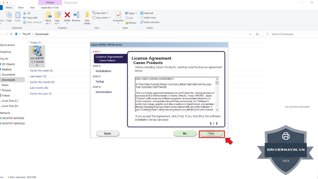 Khi được yêu cầu đồng ý với các điều khoản và điều kiện sử dụng của Canon, hãy đọc kỹ các thông tin này. Nếu bạn đồng ý, chọn Yes để tiếp tục. Điều này là bắt buộc để bạn có thể sử dụng phần mềm và các dịch vụ hỗ trợ của Canon một cách hợp pháp.