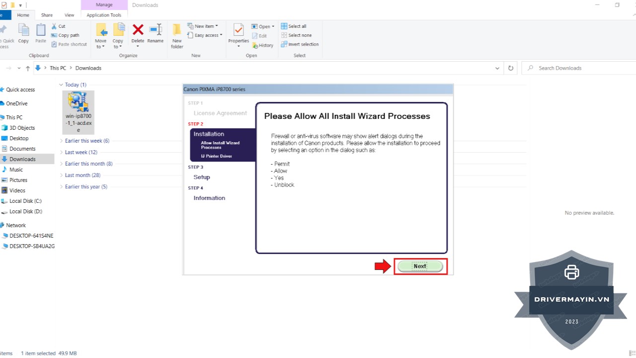 Khi bạn mở tệp cài đặt, một cửa sổ thông báo sẽ xuất hiện, yêu cầu bạn xác nhận việc bắt đầu cài đặt. Tại đây, bạn chỉ cần chọn Next để tiếp tục với quá trình cài đặt. Các bước tiếp theo sẽ giúp bạn hoàn tất việc thiết lập driver cho máy in.