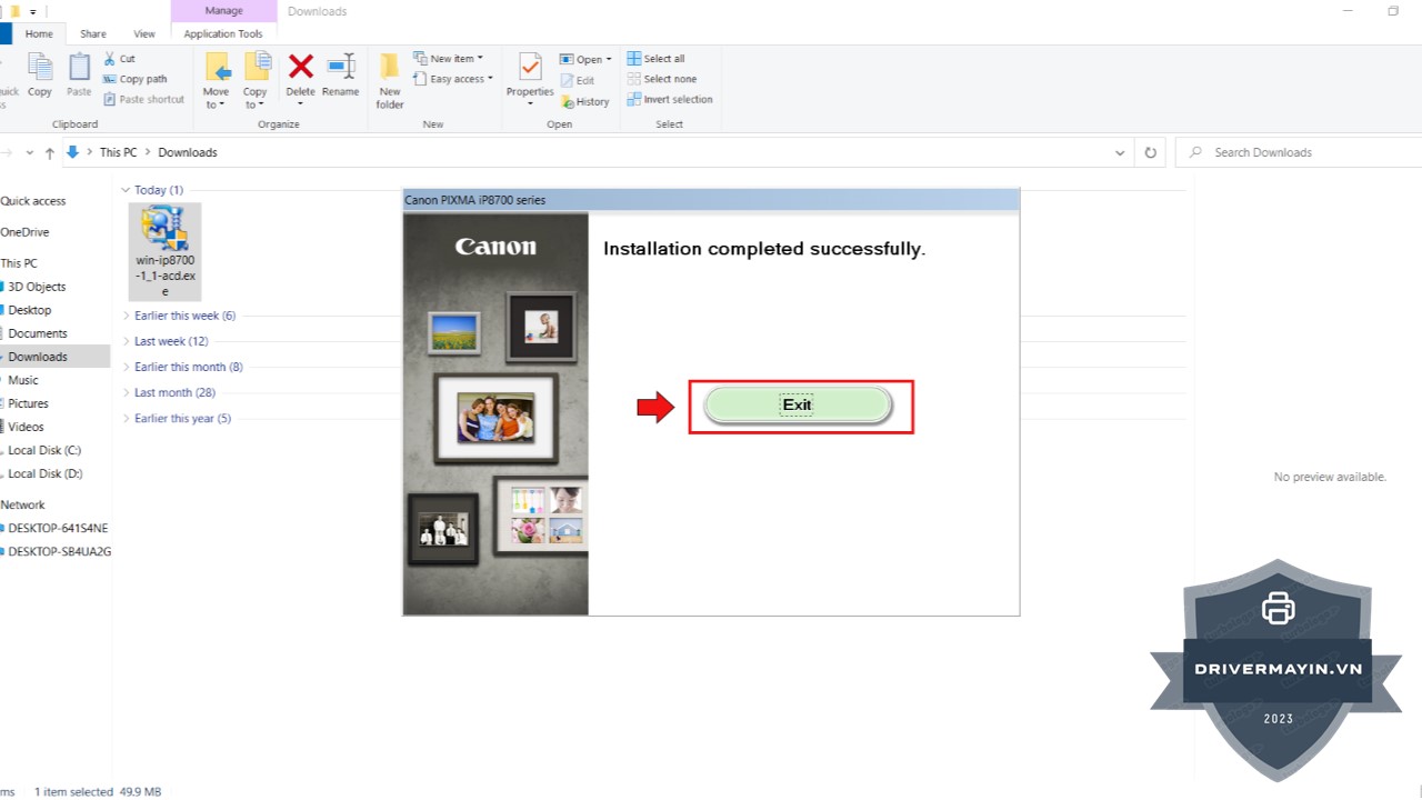 Cuối cùng, khi quá trình cài đặt driver hoàn tất, bạn sẽ thấy một thông báo cho biết rằng quá trình cài đặt đã thành công. Lúc này, bạn chỉ cần nhấn Exit để thoát khỏi cửa sổ cài đặt và kết thúc quá trình cài đặt driver cho máy in Canon PIXMA iP8770.