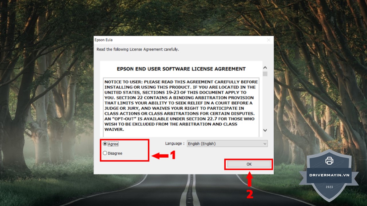 Tiếp theo, bạn cần chọn Agree để đồng ý với các điều khoản sử dụng của Epson, sau đó nhấn OK để tiếp tục.
