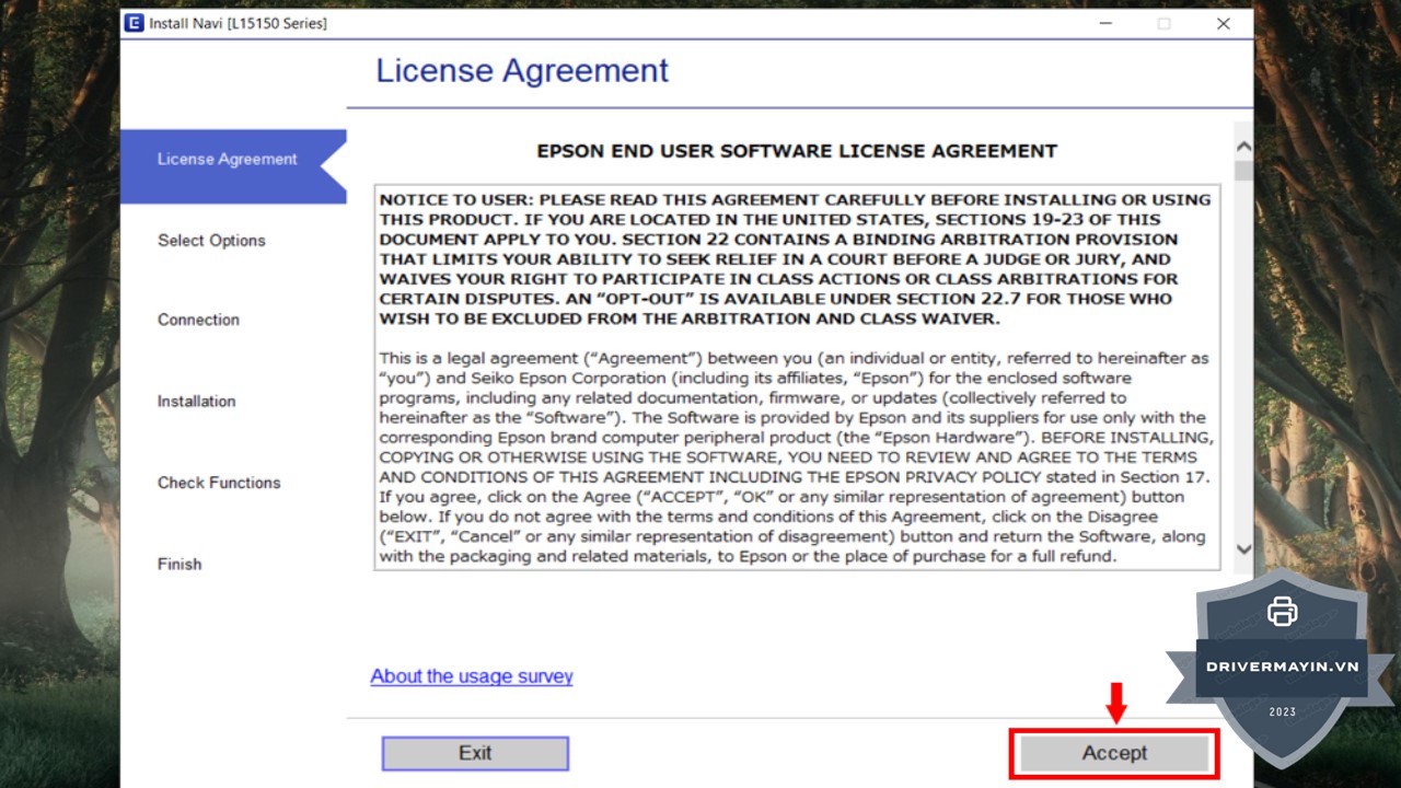 Chọn "Accept" để đồng ý với các điều khoản và chính sách của Epson, sau đó tiến hành cài đặt Driver.