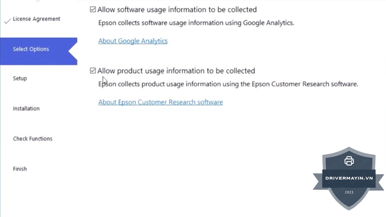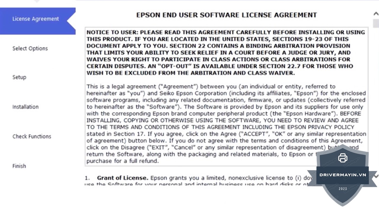 Đọc và Chấp Nhận Điều Khoản: Trong bước tiếp theo, bạn sẽ thấy các điều khoản sử dụng của Epson. Đọc kỹ các điều khoản này và nếu đồng ý, hãy tích vào ô Chấp nhận và nhấn OK để tiếp tục.