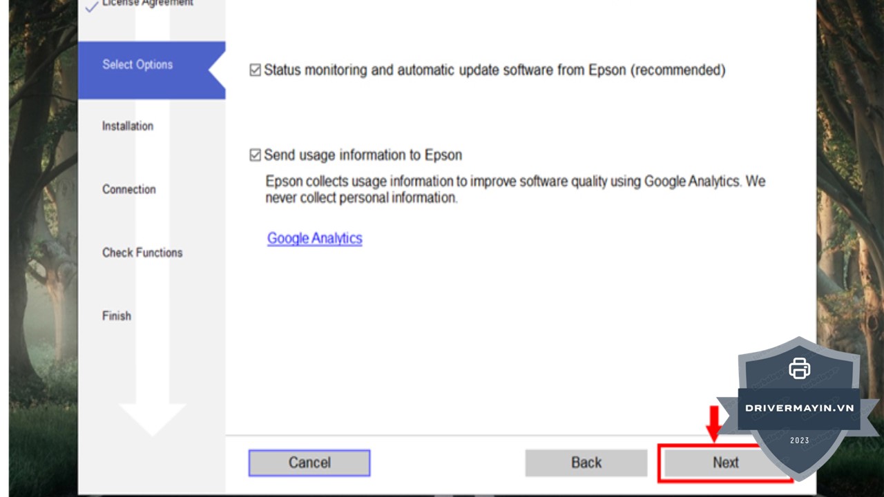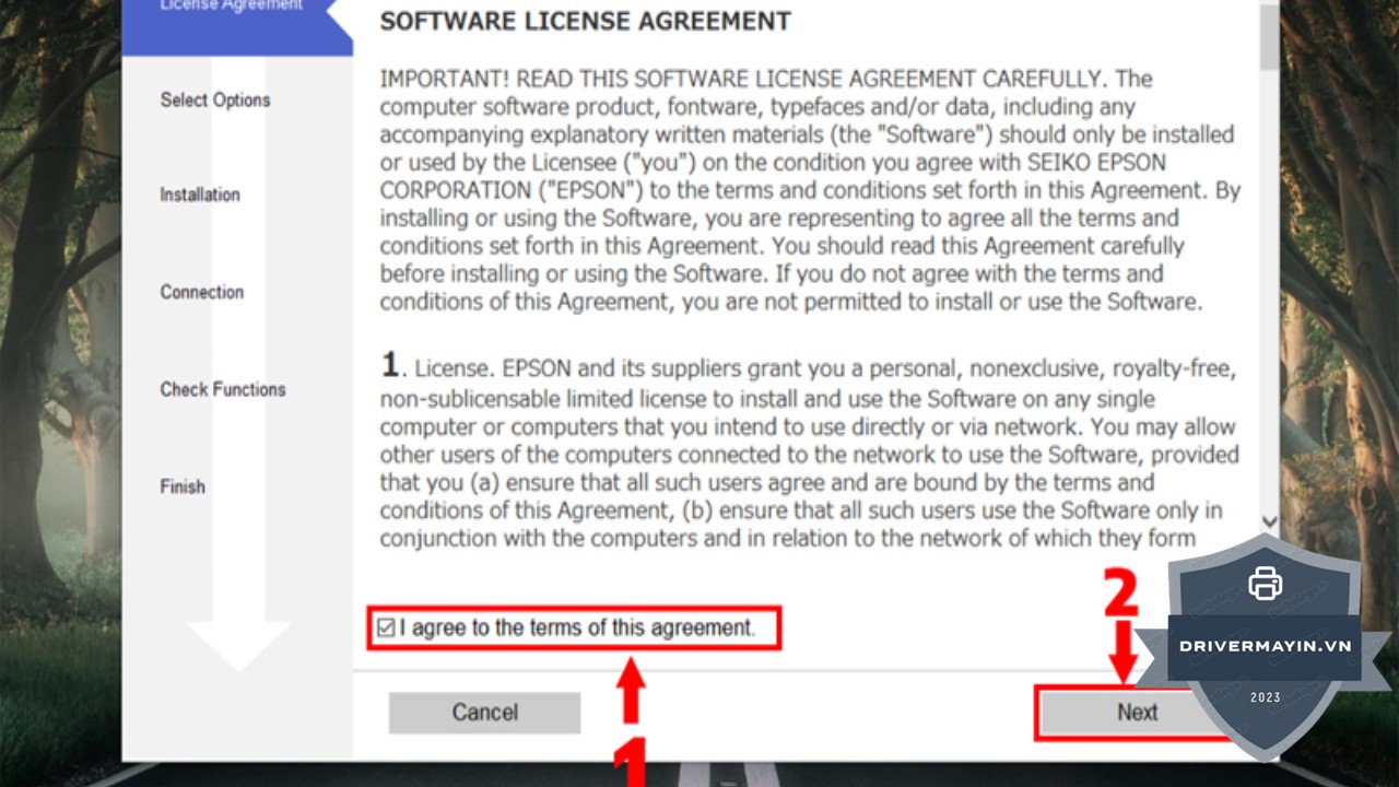 Khi cửa sổ cài đặt driver xuất hiện, bạn sẽ thấy một bảng điều khoản của Epson. Để tiếp tục, bạn cần tick chọn vào ô đồng ý với các điều khoản. Sau khi làm xong, nhấn Next để tiến hành bước tiếp theo.