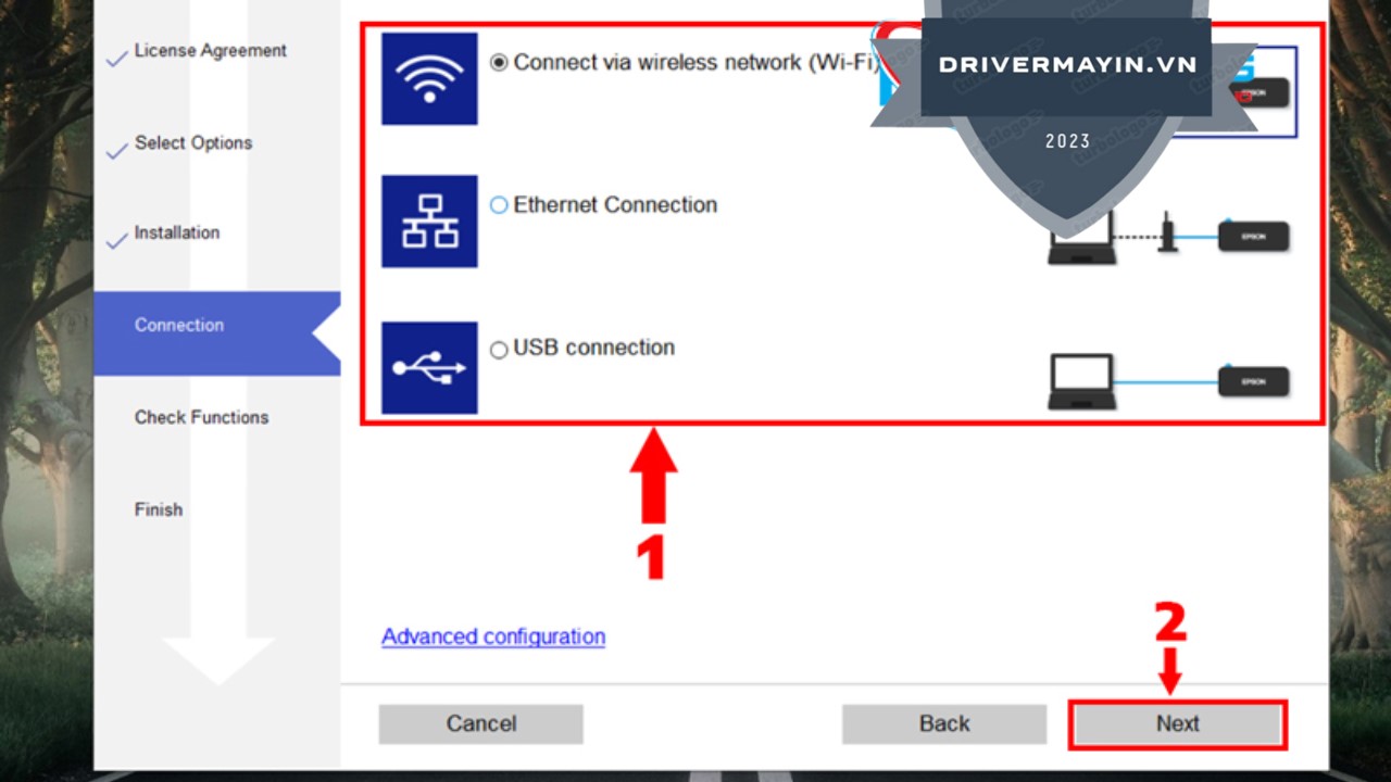 Tiếp theo, hệ thống sẽ yêu cầu bạn chọn kiểu kết nối mà bạn đang sử dụng để kết nối máy in với máy tính (USB, mạng LAN hoặc Wi-Fi). Sau khi chọn xong, nhấn Next để tiếp tục cài đặt driver.