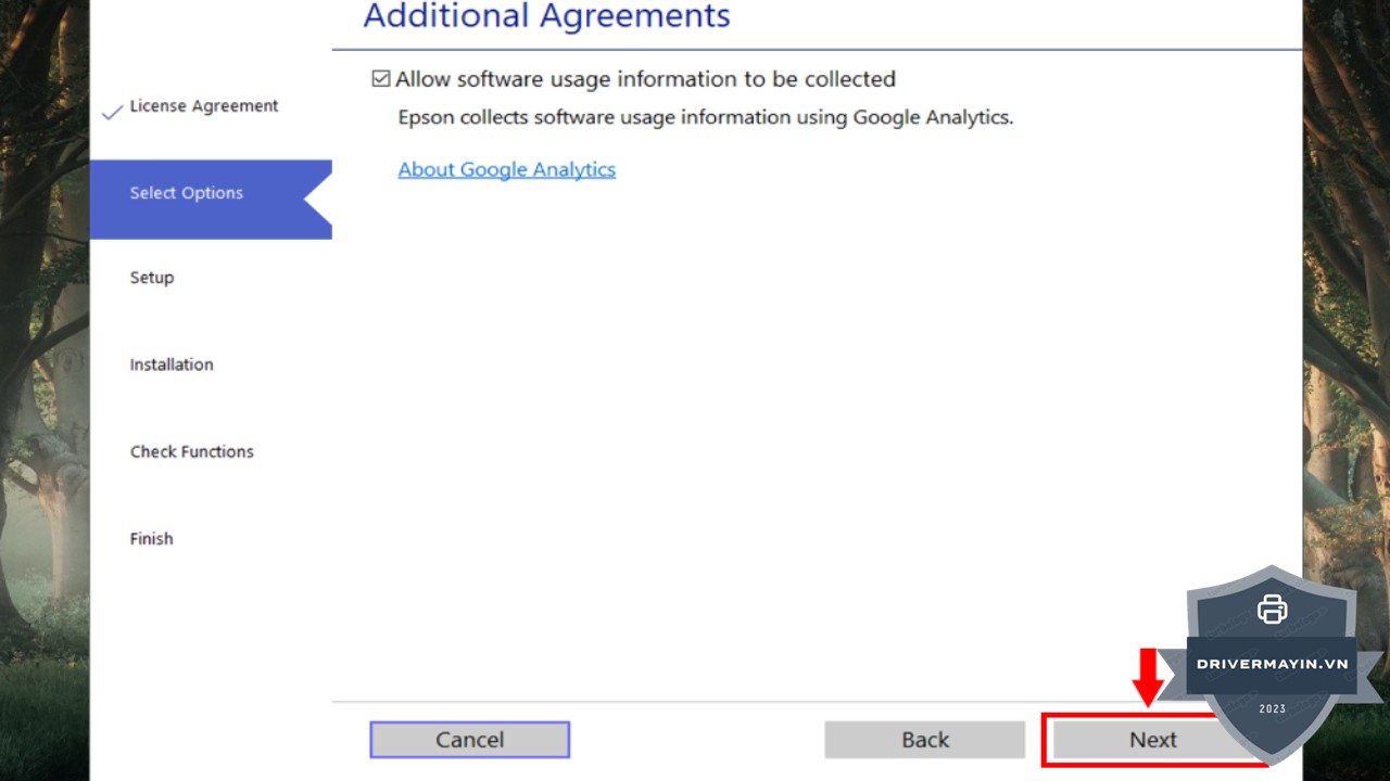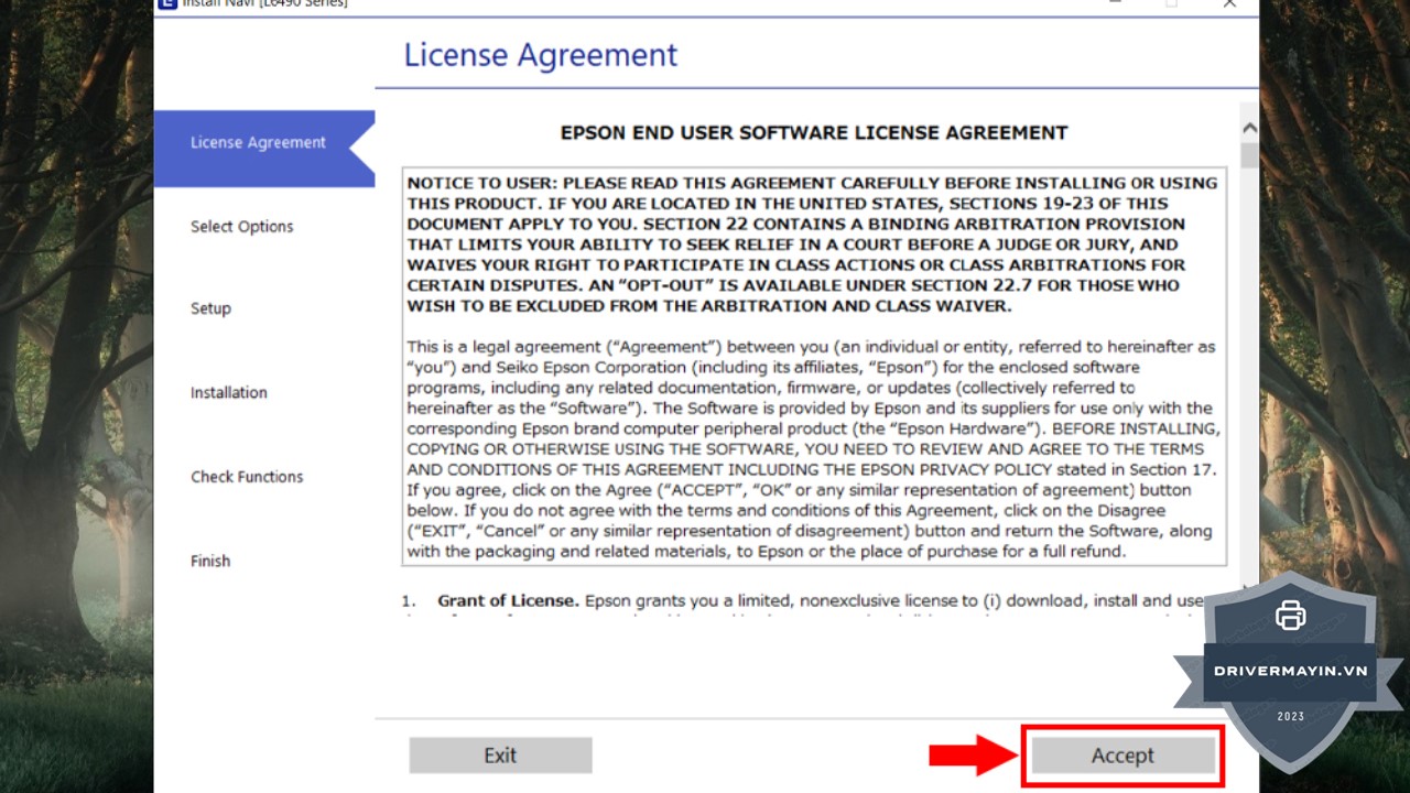 Khi cửa sổ cài đặt xuất hiện, bạn sẽ thấy một bảng yêu cầu đồng ý với các điều khoản và điều kiện của Epson. Hãy chọn Accept để đồng ý và tiếp tục.