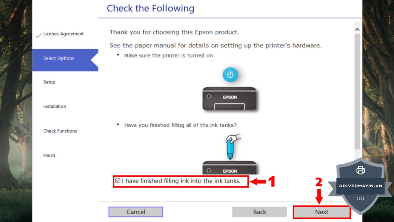 Trước khi tiếp tục, đảm bảo rằng máy in của bạn đã được nạp đầy đủ mực in. Nếu mực đã được nạp đầy, tick vào ô "I have finished filling ink into the ink tanks" và nhấn Next để tiếp tục.