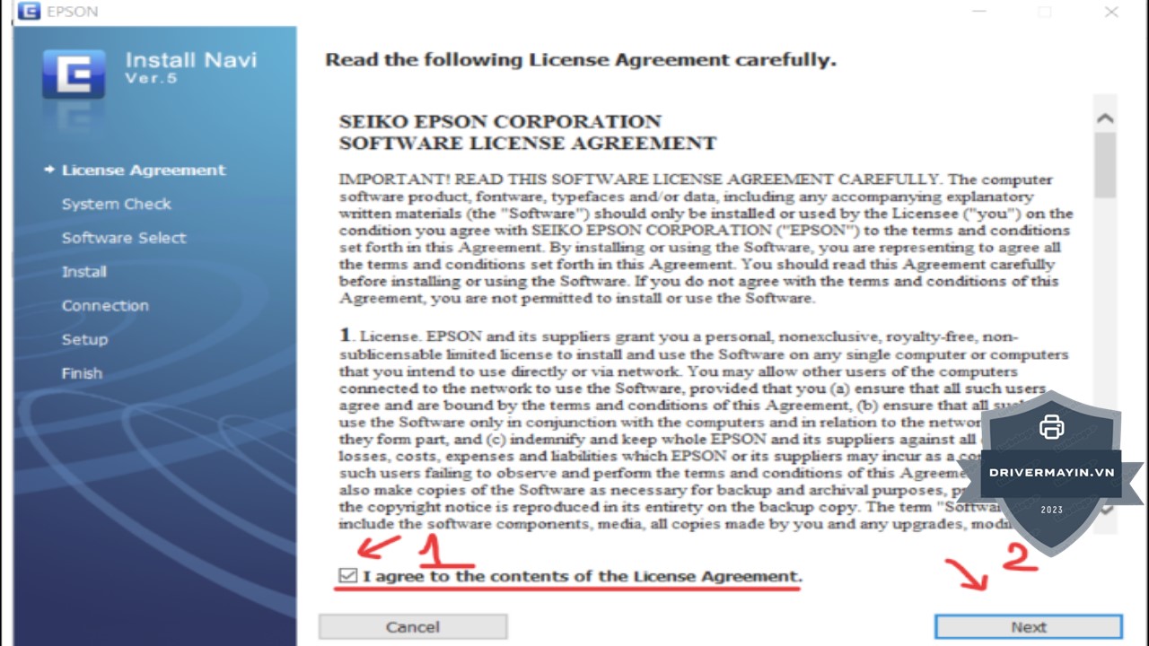 Khi cửa sổ cài đặt xuất hiện, bạn sẽ thấy mục "I agree...". Đánh dấu vào ô này để đồng ý với các điều khoản sử dụng của Epson. Sau đó, nhấn "Next" để tiếp tục.