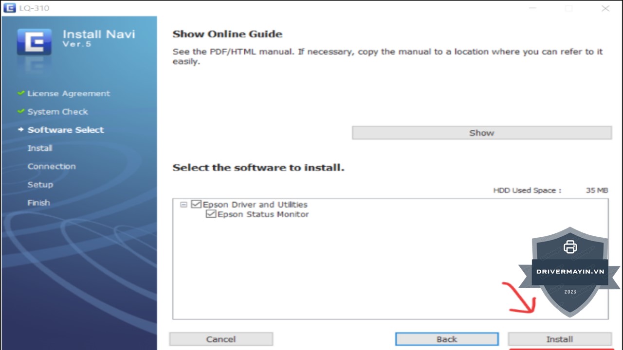 Tiếp theo, bạn sẽ thấy mục "Install". Nhấn vào đó để tiến hành cài đặt tự động driver máy in Epson LQ-310. Quá trình này sẽ tự động cài đặt các tệp cần thiết để máy in hoạt động.
