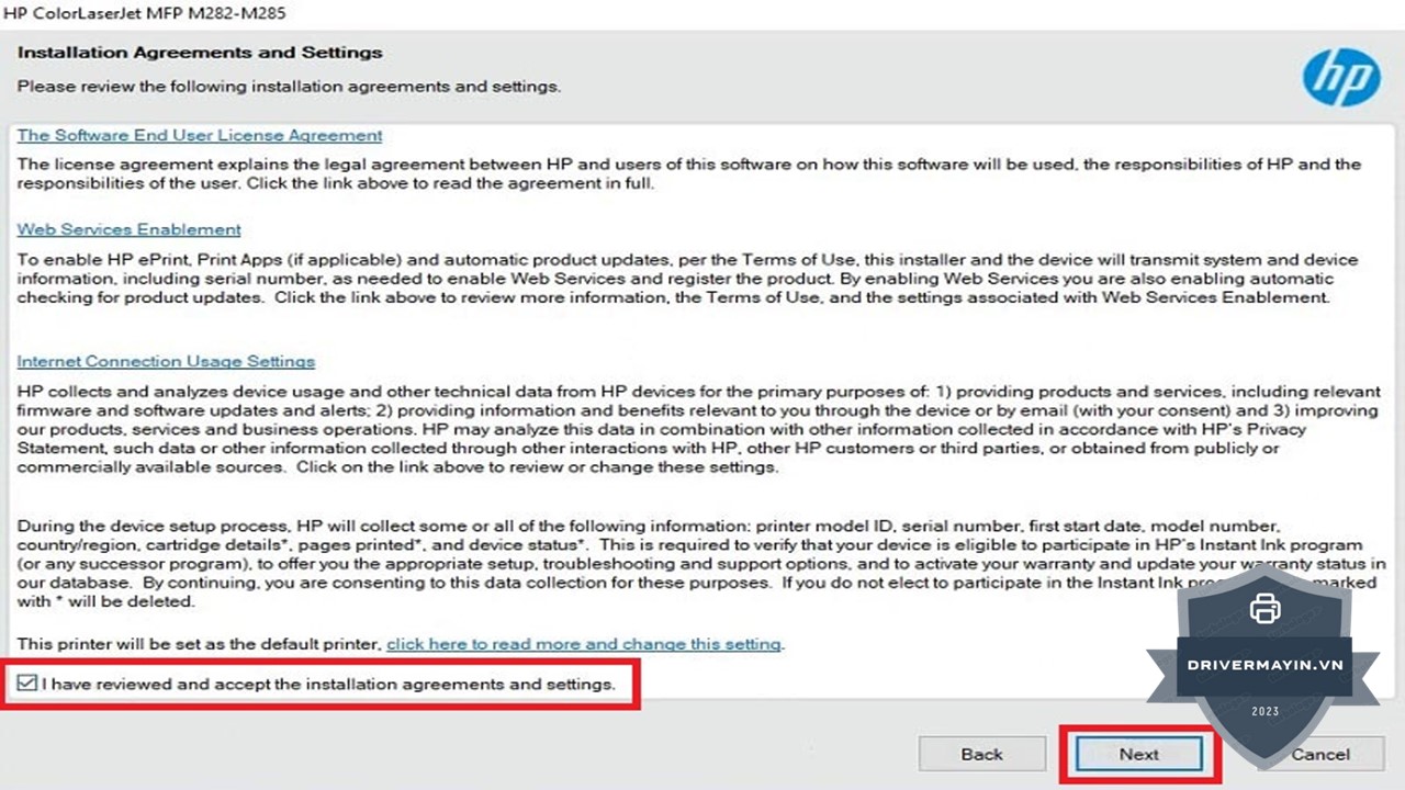 Bước 4: Một hộp thoại mới sẽ xuất hiện yêu cầu bạn đồng ý với các điều khoản và chính sách của HP. Tích vào ô vuông bên trái để đồng ý, sau đó nhấn "Next" để tiếp tục.