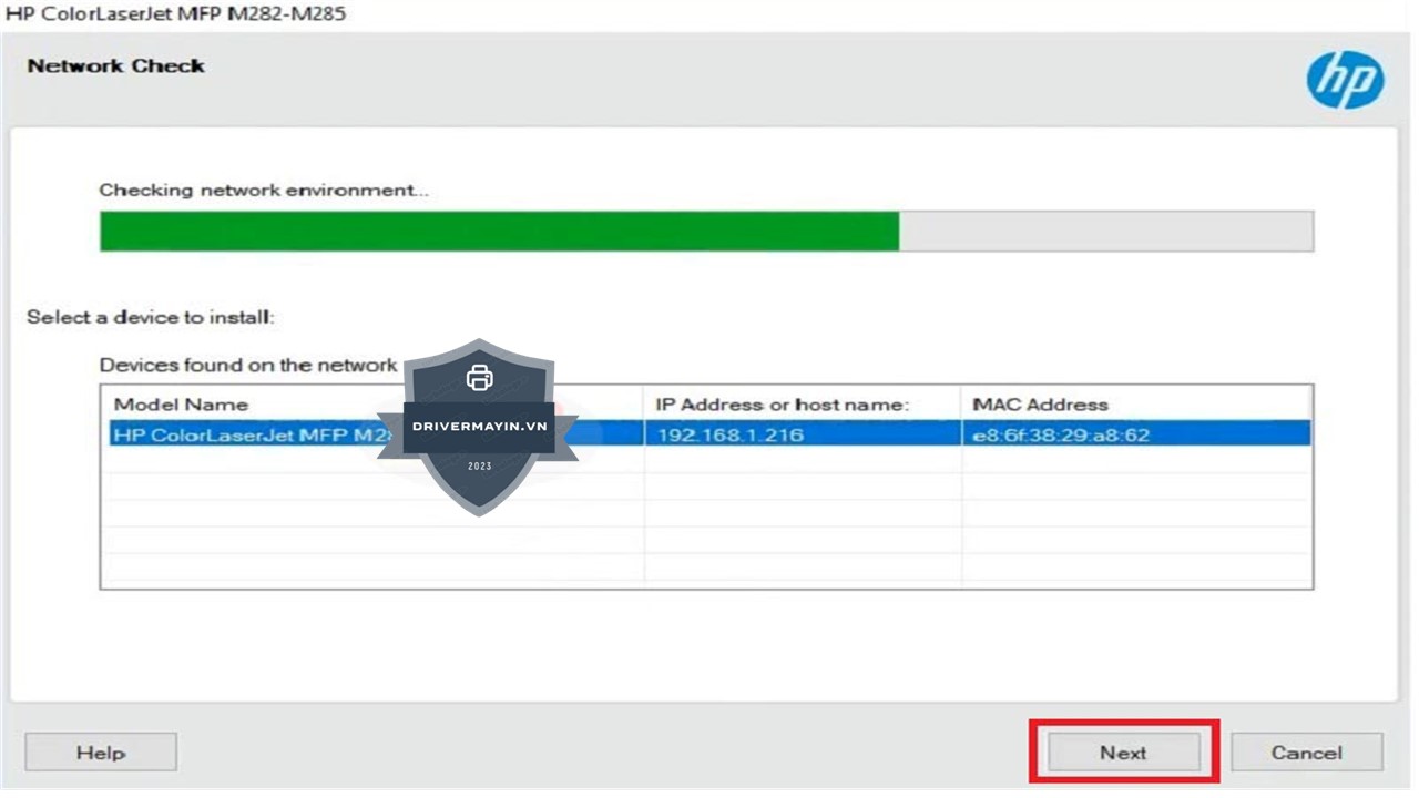 Bước 7: Sau khi máy in được nhận diện, hệ thống sẽ hiển thị tên và địa chỉ IP của máy in. Bạn chỉ cần chọn "Next" để tiếp tục.