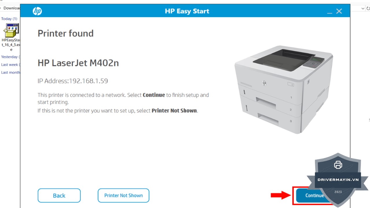 Bước 4: Nếu phần mềm không tự động nhận diện máy in của bạn, hãy chọn Printer Not Shown để cài đặt driver cho máy in cần thiết. Nếu máy in đã được hiển thị đúng, bạn chỉ cần nhấn Continue.