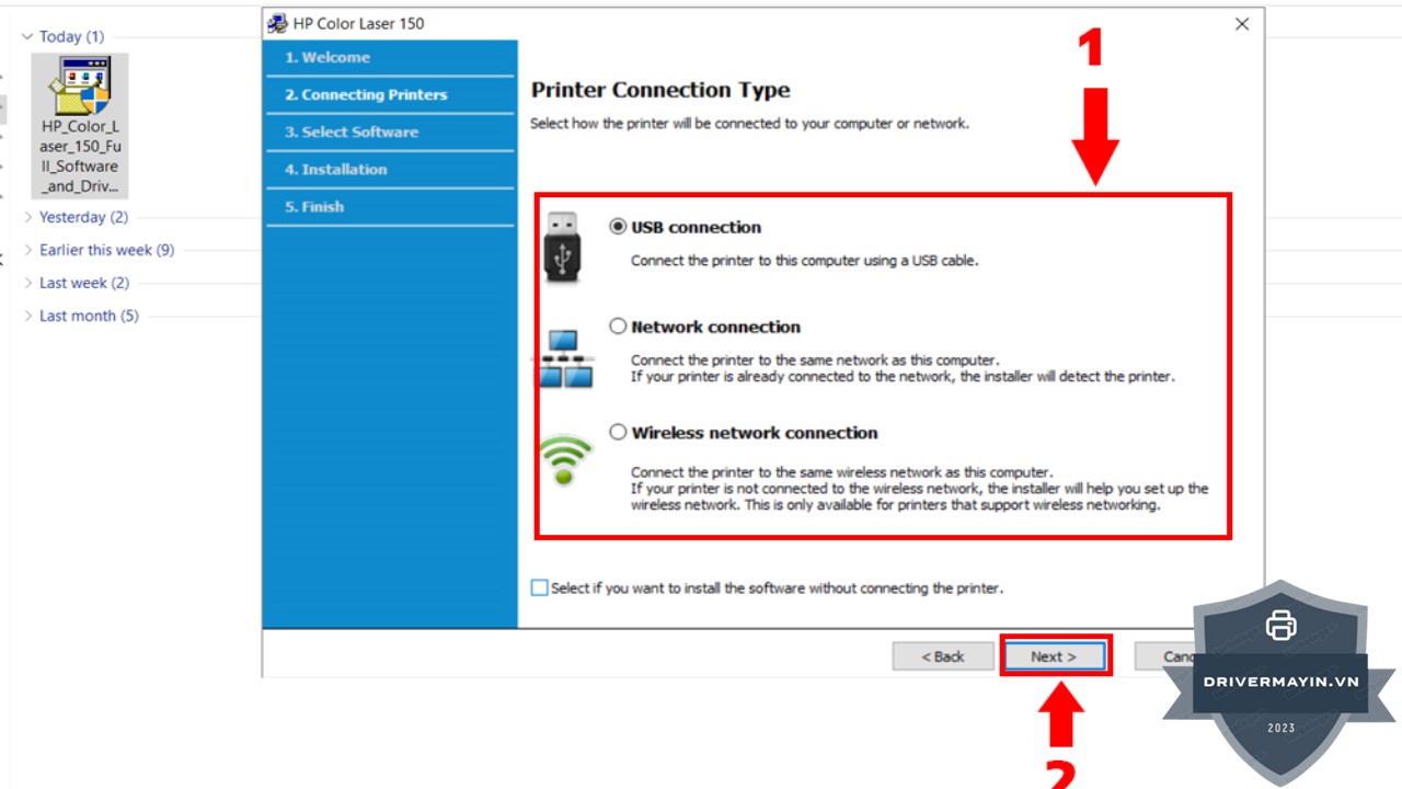 Ở bước này, bạn cần chọn phương thức kết nối mà bạn sẽ sử dụng cho máy in. Bạn có thể chọn kết nối qua USB, Wi-Fi hoặc Mạng LAN tùy thuộc vào cách mà máy in của bạn được kết nối với máy tính. Sau khi chọn xong, nhấn Next để tiếp tục.