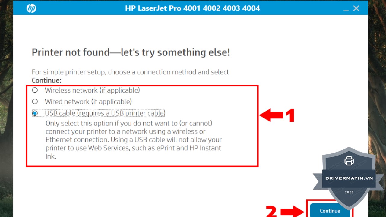 Bước 4: Lúc này, cửa sổ cài đặt sẽ yêu cầu bạn lựa chọn kết nối giữa máy in và máy tính. Chọn "Continue" một lần nữa và hệ thống sẽ hướng dẫn bạn chọn phương thức kết nối mà bạn đang sử dụng, chẳng hạn như qua cáp USB hoặc mạng Wi-Fi. Sau khi chọn, nhấn "Continue" để tiếp tục.