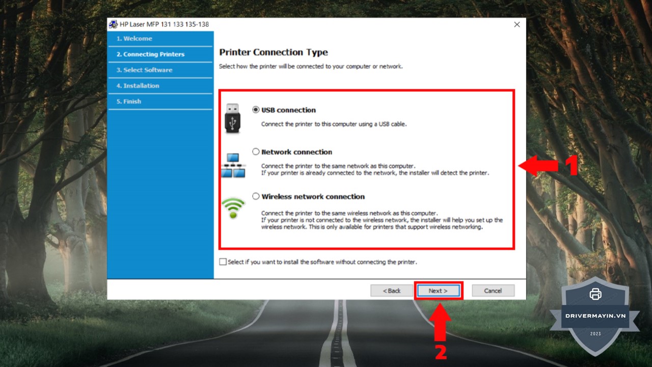 Tại bước này, bạn sẽ cần lựa chọn kiểu kết nối giữa máy tính và máy in. HP Laser MFP 137fnw hỗ trợ kết nối qua cả USB và Wi-Fi. Bạn có thể chọn một trong hai kiểu kết nối, tùy thuộc vào cách bạn muốn kết nối máy in với máy tính của mình: