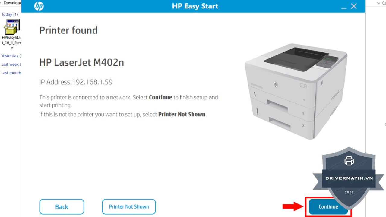 Tiếp theo, bạn nhấn Continue để tiếp tục các bước cài đặt. Nếu phần mềm không tự nhận diện đúng máy in của bạn, đừng lo, chỉ cần chọn Printer Not Shown để chọn máy in thủ công từ danh sách.