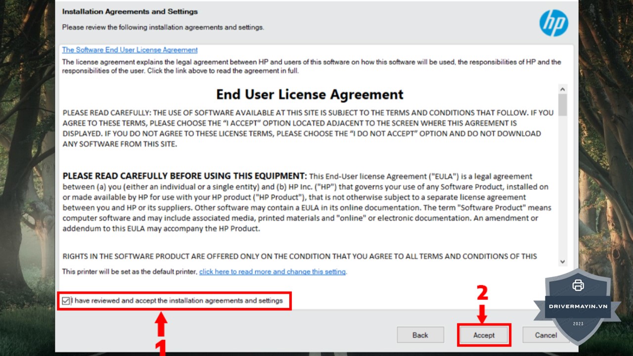 Bạn sẽ thấy một màn hình yêu cầu bạn chấp nhận các điều khoản và điều kiện của HP. Hãy đọc kỹ và tích chọn vào ô "I accept the terms of the license agreement" (Tôi chấp nhận các điều khoản của thỏa thuận cấp phép).