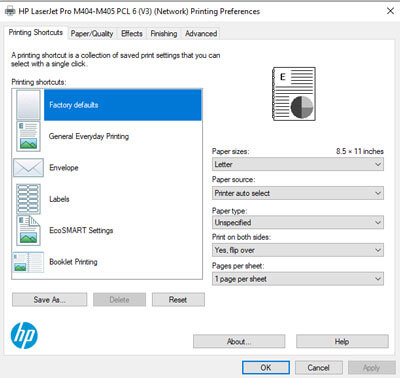 Chọn máy in cần kiểm tra: Tìm và nhấn chuột phải vào máy in HP LaserJet Pro M404DW (hoặc M404DN) đã cài đặt. Chọn Printing Preferences để kiểm tra các thiết lập in ấn.