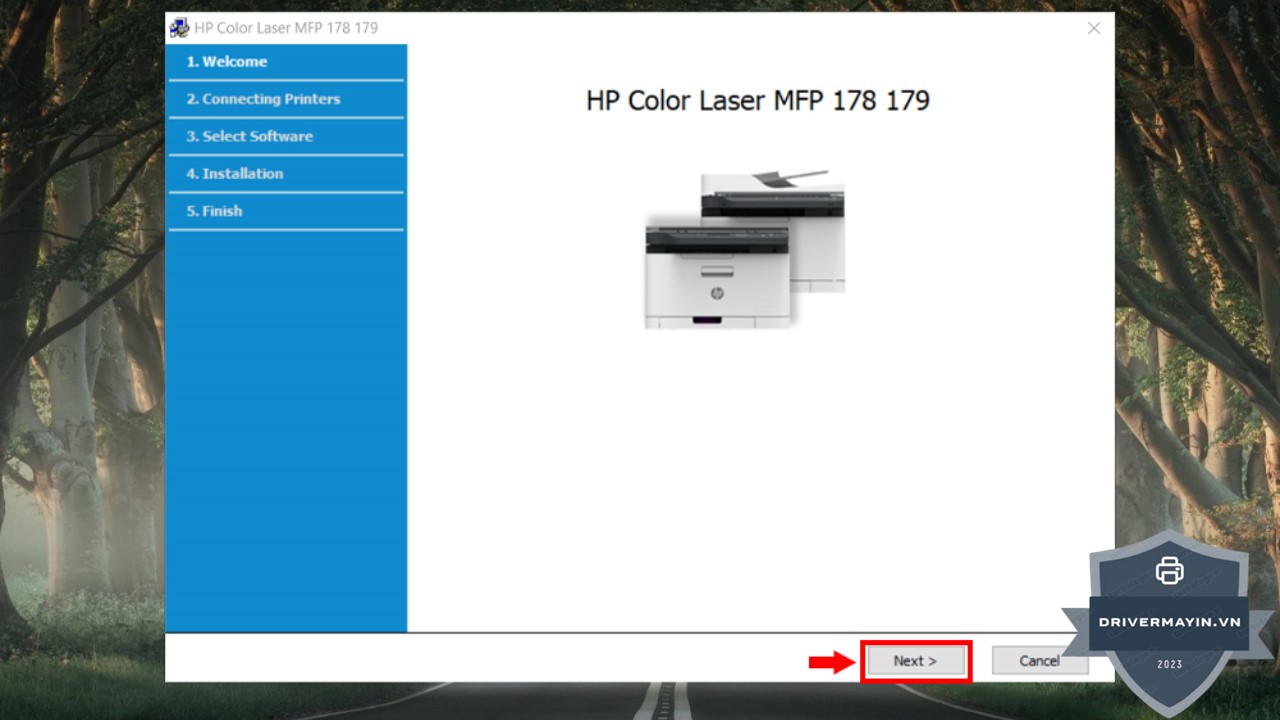 Sau khi chọn kiểu kết nối, hãy nhấn Next để hệ thống tiếp tục cài đặt và chuẩn bị máy in cho việc sử dụng.