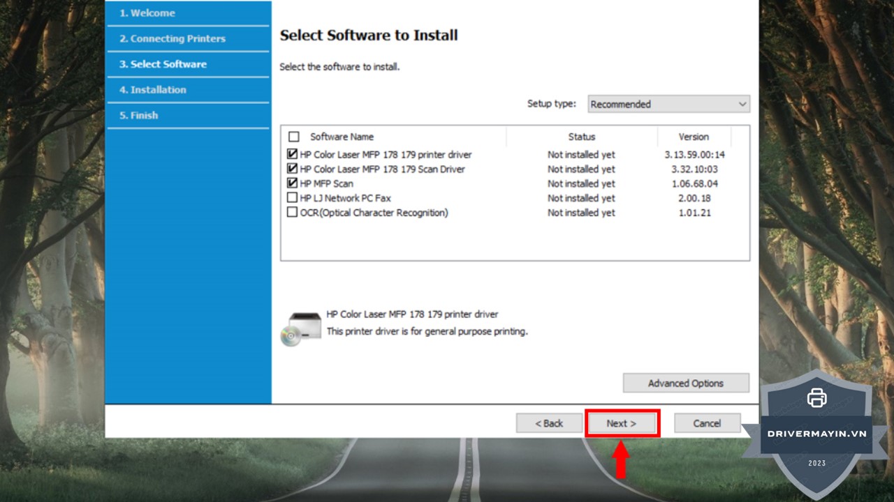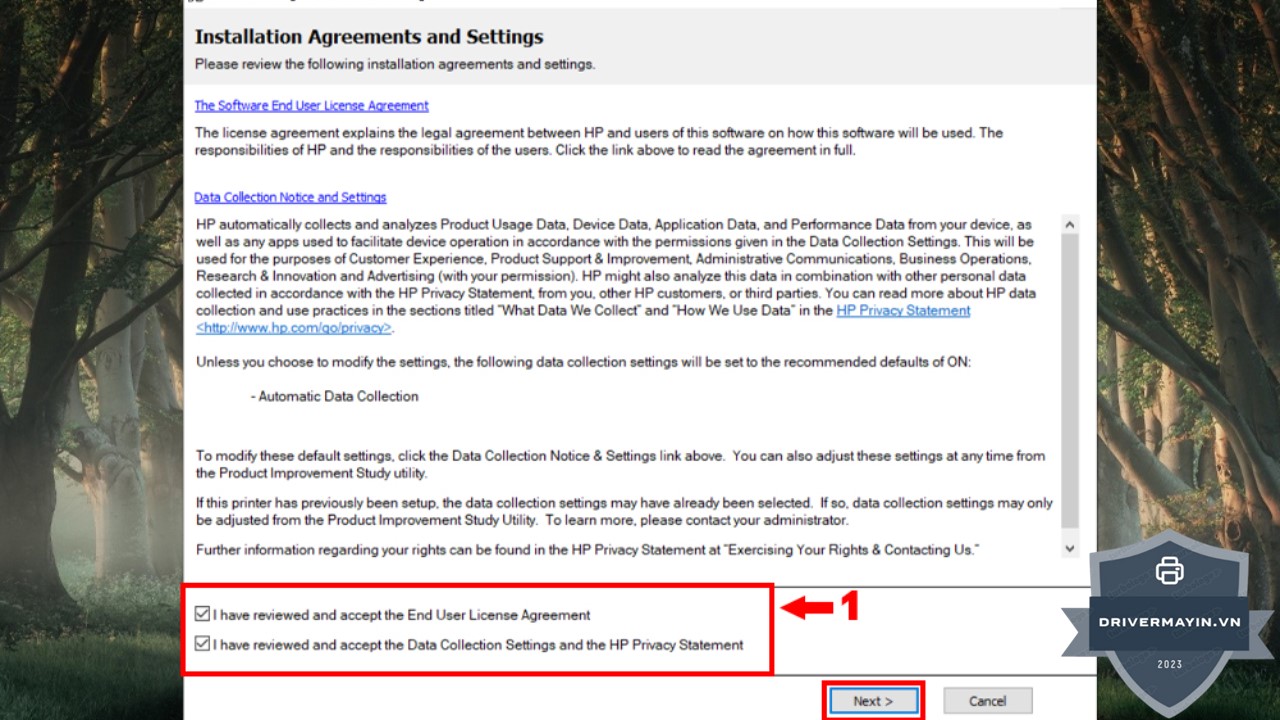 Tiếp theo, bạn sẽ thấy một màn hình yêu cầu bạn lựa chọn các tùy chọn cài đặt. Bạn cần tích chọn vào hai ô như hình minh họa dưới đây để xác nhận các tính năng và cài đặt cần thiết cho máy in của bạn. Sau khi chọn xong, nhấn Next để tiếp tục.
