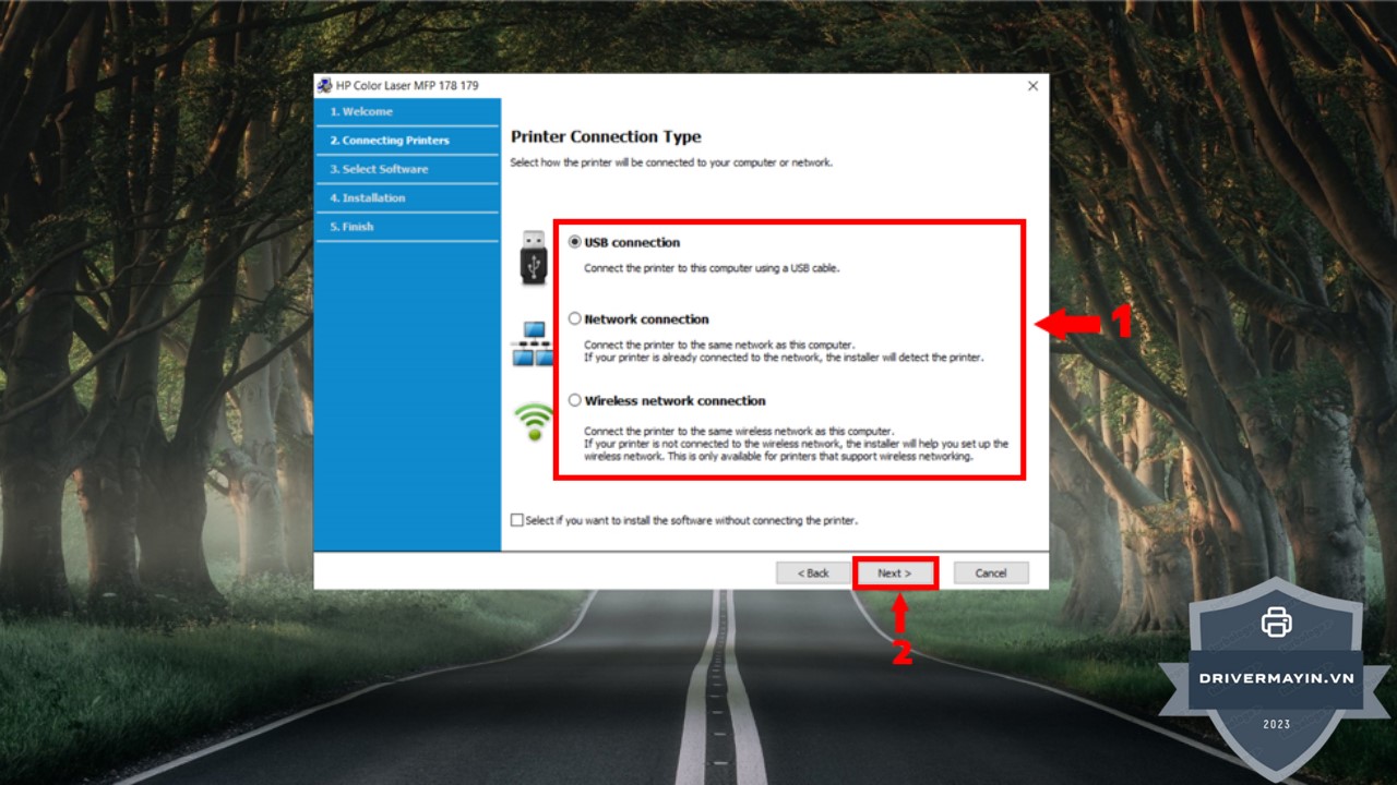 Ở bước này, bạn sẽ được yêu cầu lựa chọn kiểu kết nối mà máy in của bạn sử dụng. Có thể là kết nối qua USB hoặc kết nối không dây (Wi-Fi). Hãy chọn phương thức kết nối phù hợp với cách bạn muốn kết nối máy in với máy tính và nhấn Next.