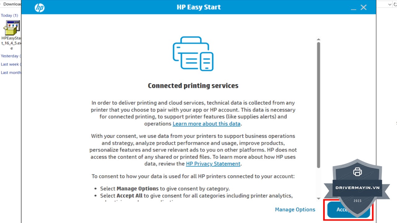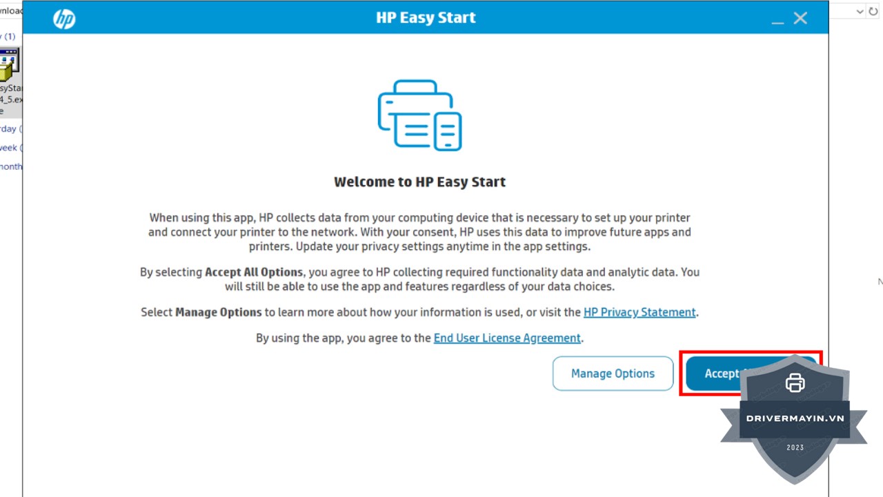 Khi cửa sổ cài đặt xuất hiện, bạn sẽ nhận được thông báo yêu cầu chấp nhận các điều khoản và điều kiện từ HP. Bạn cần chọn "Accept All Options" để đồng ý với các điều khoản và tiếp tục cài đặt driver. Việc này giúp đảm bảo bạn đã đọc và đồng ý với những yêu cầu cần thiết của hãng HP.