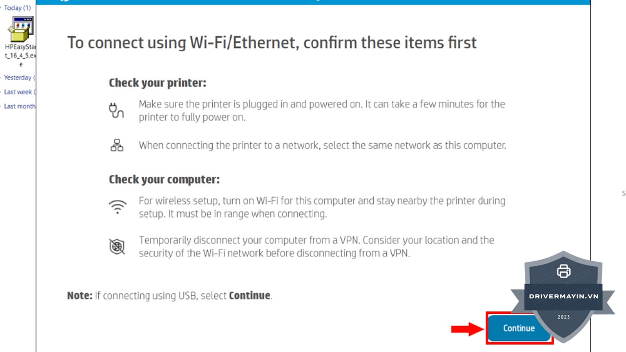 Nếu bạn đang sử dụng máy in qua mạng, hãy đảm bảo rằng kết nối mạng của bạn (Wi-Fi hoặc Ethernet) ổn định trước khi cài đặt. Nếu kết nối mạng không ổn định hoặc máy tính không thể kết nối với máy in qua mạng, quá trình cài đặt sẽ gặp phải lỗi. Tuy nhiên, HP Neverstop 1000A chủ yếu sử dụng kết nối USB, vì vậy nếu bạn chỉ sử dụng cáp USB, bước này không cần thiết.