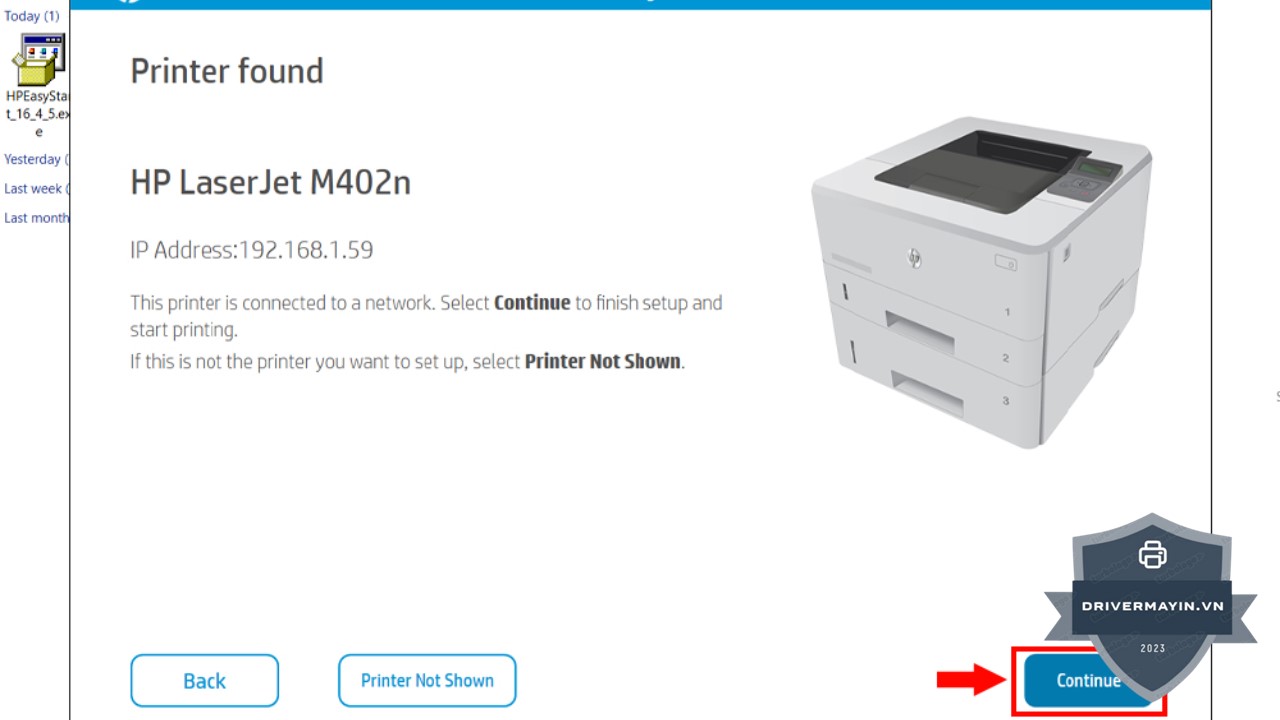 Nếu phần mềm không tự động nhận diện máy in của bạn, bạn có thể chọn "Printer Not Shown" để tìm và cài đặt driver cho máy in HP Neverstop Laser 1000A. Nếu máy in đã được hiển thị đúng, chỉ cần chọn "Continue" để tiếp tục cài đặt mà không cần thay đổi gì.