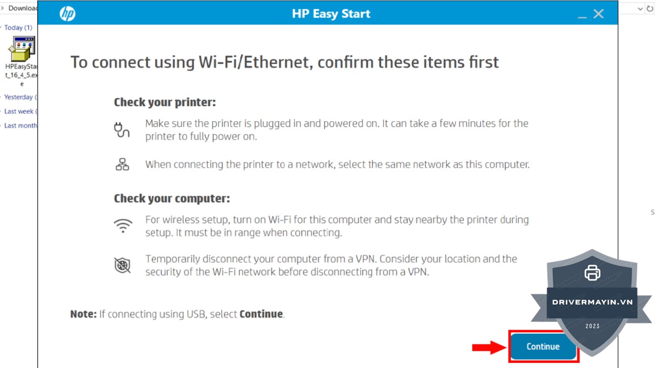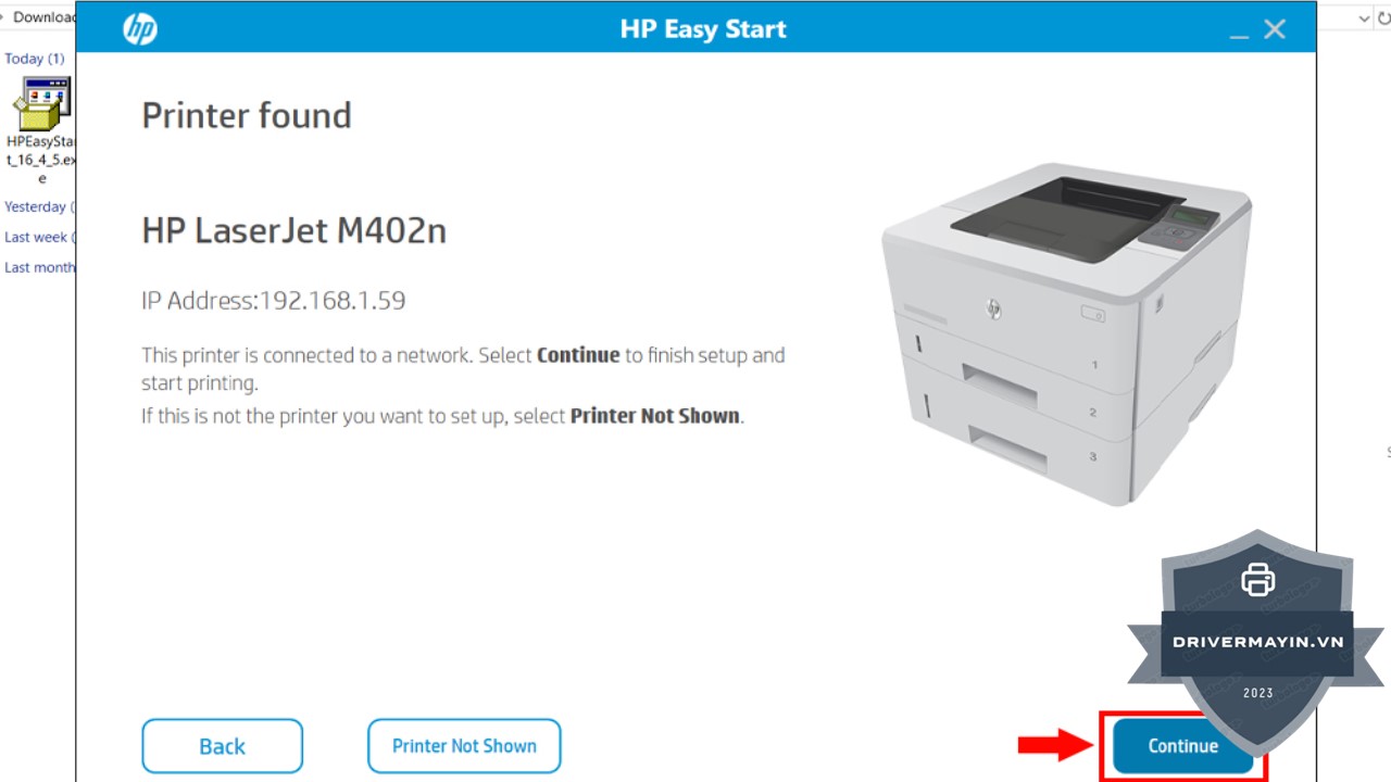 Bước 4: Nếu phần mềm không tự động nhận diện máy in của bạn hoặc máy in chưa được hiển thị trong danh sách, đừng lo lắng. Chỉ cần chọn Printer Not Shown, phần mềm sẽ yêu cầu bạn tìm và chọn máy in mà bạn muốn cài đặt driver cho nó. Ngược lại, nếu máy in đã được phần mềm tự động nhận diện và hiển thị đúng, bạn chỉ cần nhấn Continue để tiếp tục cài đặt mà không cần thực hiện thêm bước nào.