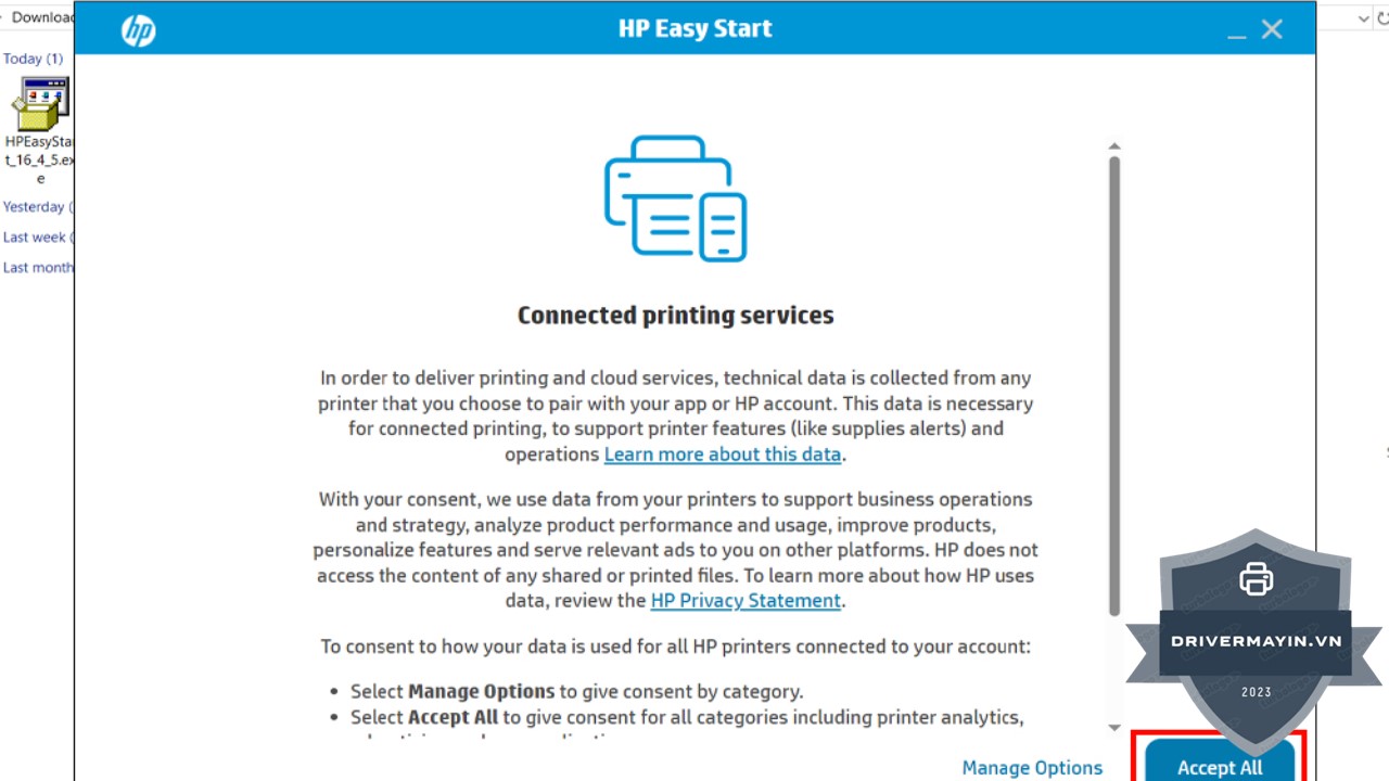 Bước 5: Sau khi máy in đã được nhận diện chính xác, bạn sẽ được yêu cầu xác nhận lại các tùy chọn cài đặt. Lựa chọn Accept All để tiếp tục, điều này sẽ đảm bảo rằng bạn không bỏ qua bất kỳ bước nào trong quá trình cài đặt và tất cả các cài đặt mặc định sẽ được áp dụng cho máy in của bạn.