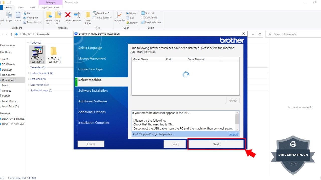 Tiếp theo, chọn máy in Brother DCP-B7640DW trong danh sách các máy in hiện ra và nhấn Next để tiếp tục.