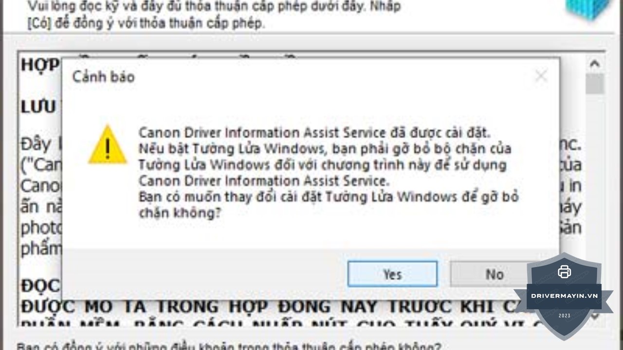 Trong quá trình cài đặt, hệ thống có thể hiển thị thông báo kiểm tra Windows Firewall. Điều này nhằm đảm bảo máy tính có thể tìm thấy máy in trong cùng mạng nội bộ.